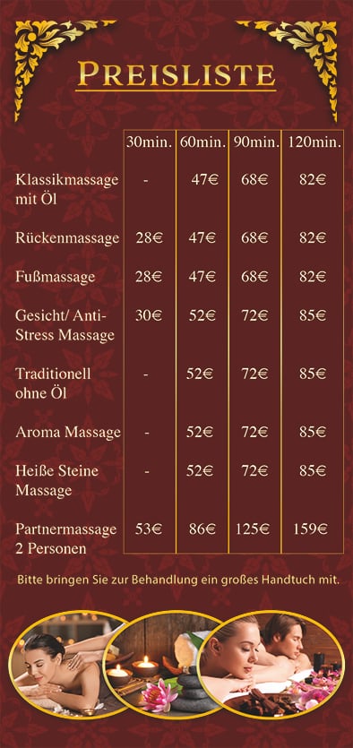 Die Partnermassage ist ideal für Freunde/Freundinnen, Liebespaare und Ehepaare. Schenken Sie Freude mit Wellness und Entspannung für einen unvergesslichen Tag. Die Art der Massagen und auch die Zeitdauer sind individuell für jede Person einzeln frei wählbar. Eine frühe Terminvereinbarung ist von Vorteil.
